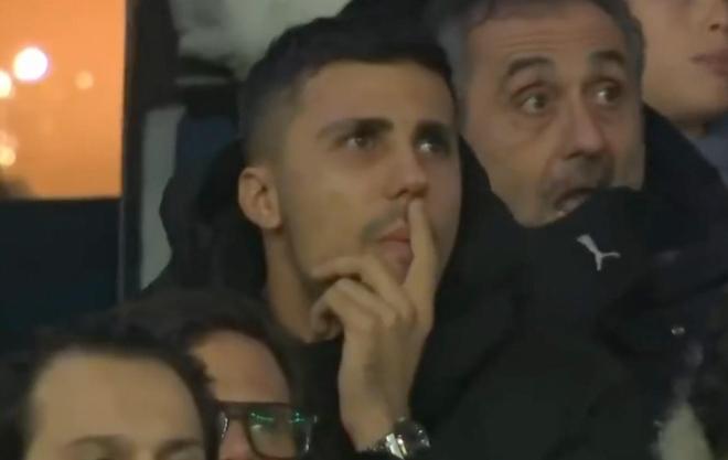 比赛第39分钟,转播镜头给到了在看台上观战的罗德里,一名解说看到罗德里后说:“呦,这是?”随后经过近十秒的沉寂后,另一名解说回应道:“一时想不起来了”。
