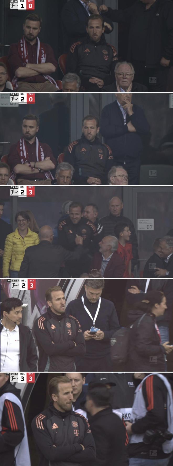 然而开场仅11分钟,拜仁就陷入了0-1落后的局面,这时转播镜头立即给到了看台上的凯恩,看起来他的脸色有些凝重。第40分钟莱比锡再进一球从而2-0领先,这时转播镜头再次立即找到凯恩,此时的他明显已经泄了气。下半场风云突变,拜仁先是1分钟内连进两球扳平比分,之后又在尾声阶段由萨内打进了反超比分的进球,这时看台上的凯恩似乎感觉到自己即将迎来第一个冠军,已经笑逐颜开。