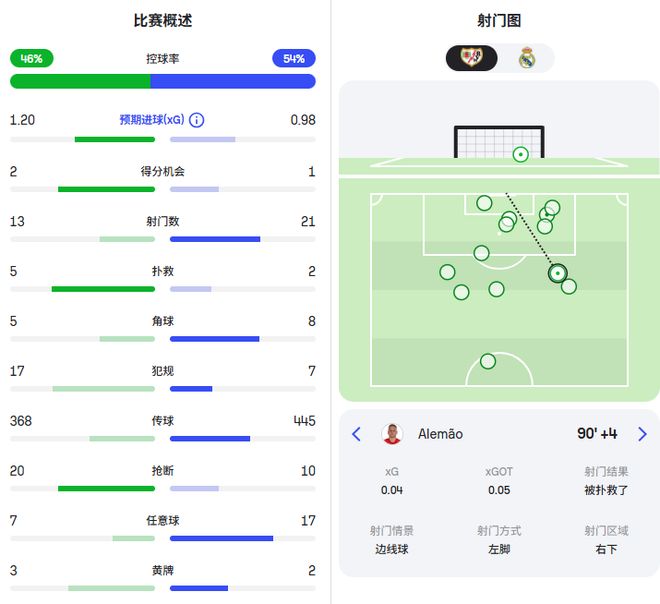 从统计数据可以看到,巴列卡诺的预期进球是1.2比0.98领先皇马,绝佳得分机会也比皇马多1次。